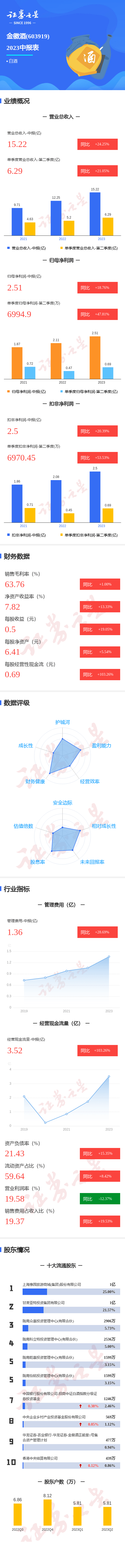 金徽酒2023中报显示,公司主营收入15.23亿元,同比上升24.25%;归母净利润2.52亿元,同比上升18.76%;扣非净利润2.51亿元,同比上升20.39%;其中2023年第二季度,公司单季度主营收入6.3亿元,同比上升21.05%;单季度归母净利润6994.9万元,同比上升47.81%;单季度扣非净利润6970.45万元,同比上升53.53%;负债率21.43%,投资收益-8.36万元,财务费用-1067.97万元,毛利率63.76%。