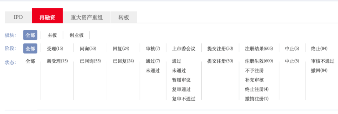 按上述统计口径,板块情况方面,再融资正常审核企业中,沪市主板84家,深市主板47家,科创板25家,创业板39家,北交所1家。