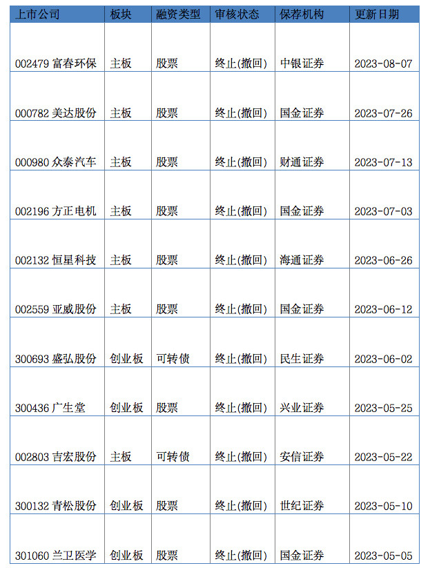 从深市情况来看,上述18单终止项目终止原因均为“撤回”,涉及富春环保、方正电机等公司。