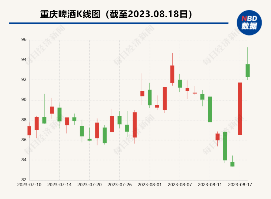 重庆啤酒(600132.SH,股价92.32元,市值264.38亿元)于8月16日晚间发布2023年半年度业绩报告称,2023年上半年,实现营业收入约85.05亿元,同比增加7.17%;实现归属于上市公司股东的净利润约8.65亿元,同比增加18.89%;实现基本每股收益1.79元,同比增加18.89%。(详见报道《10~15元就能买高端产品犒劳自己——重庆啤酒总裁李志刚:为何今年仍看好高端啤酒市场》