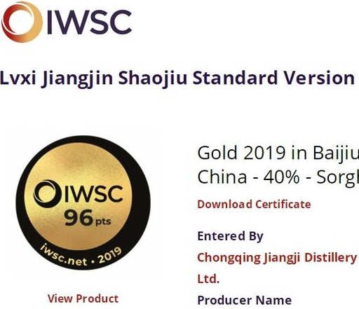 江小白酒业旗下驴溪酒厂的江津驴溪烧酒标准版,IWSC得分96分,是其三枚金奖产品中得分最高的产品。