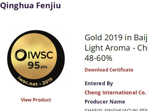 汾酒集团旗下汾酒股份的青花汾酒,IWSC得分95分,是其唯一的一枚金奖产品。
