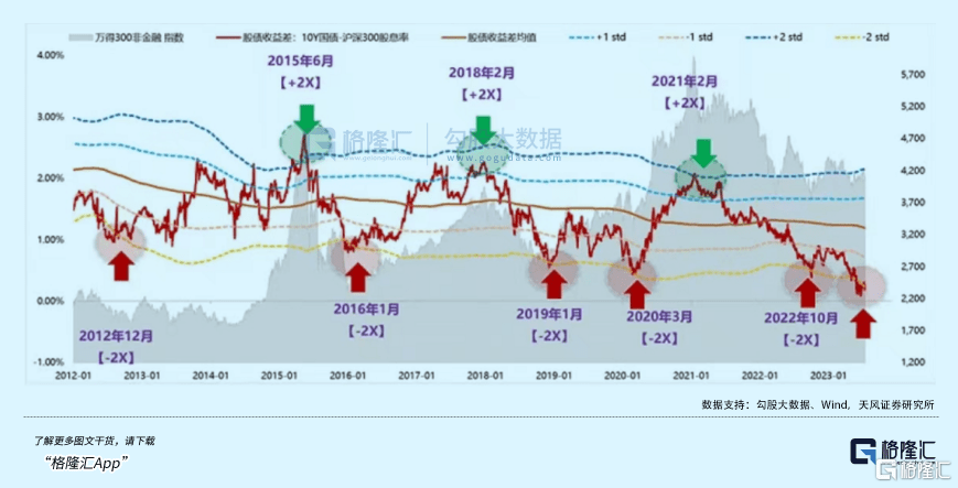 当前,沪深300指数的PE为11.51倍,位于最近5年估值下限区间,跟2020年10月、2020年3月低点水平相差很小了。从另外的角度看,当前沪深300已经来到国债收益均值2倍负标准差的位置了,而此前10年内出现过5次,包括2012年12月、2016年1月、2019年1月、2020年3月、2022年10月。后来,没过多久,市场迎来了绝地反击。