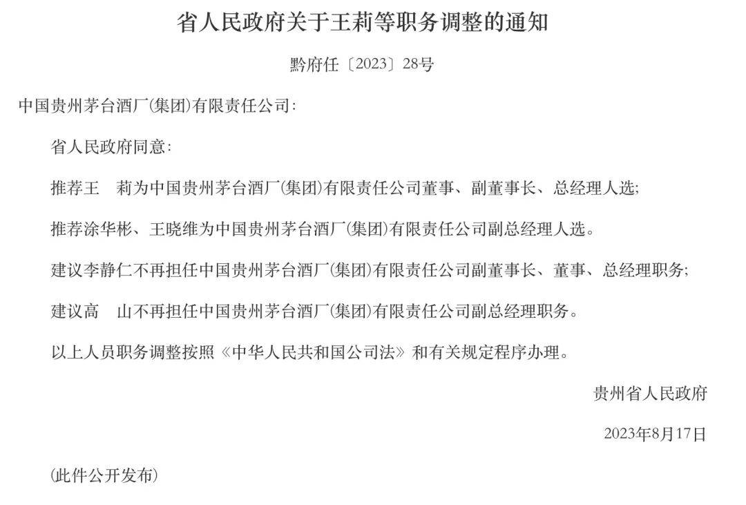 具体来看,贵州省人民政府同意,推荐王莉为茅台集团董事、副董事长、总经理人选;推荐涂华彬、王晓维为茅台集团副总经理人选;建议李静仁不再担任茅台集团副董事长、董事、总经理职务;建议高山不再担任茅台集团副总经理职务。