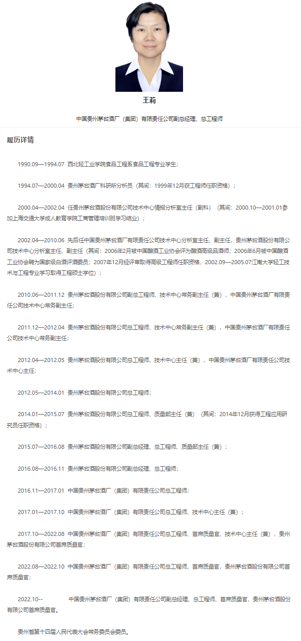 据公开资料显示,王莉出生于1972年10月,1994年从西北轻工业学院(现为陕西科技大学)食品工程专业毕业后,王莉进入茅台酒厂并长期负责技术类工作。2010年,王莉升任贵州茅台副总工程师,次年就任总工程师;2015年王莉任贵州茅台副总经理;2016年,王莉晋升为茅台集团总工程师,并一直担任该职务到此次任命前;2022年10月,王莉还成为茅台集团副总经理。