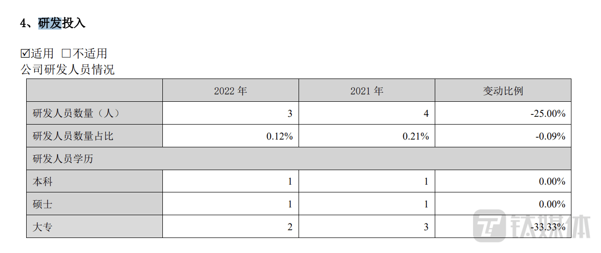 看似在新产品研发方面下足了功夫。但是今年上半年,公司的研发费用仅为71.84万元,占公司营收的比重为0.08%。对比同行上市公司来看,今年上半年,(002732.SZ)研发费用为812.79万元,占营收比重为0.84%;(300898.SZ)的研发费用为916.92万元,占营收比重为2.05%,的研发费用率低于同行。在研发成员上,在去年仅有3名研发人员,相比2021年还少了1名。