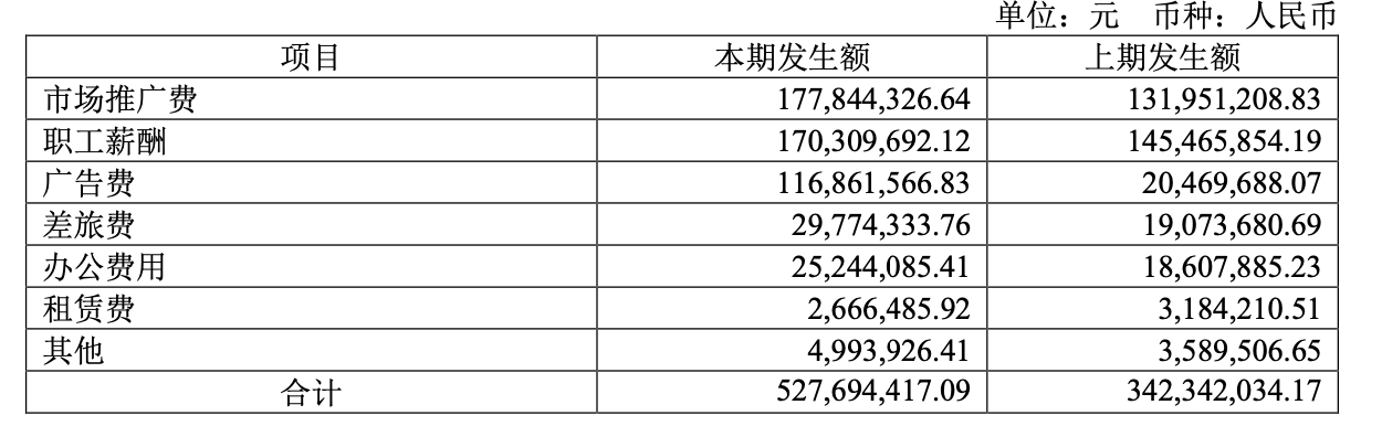 其中广告费用20222年上半年2046.97万元,今年上半年一跃增长至1.17亿元,同比增长近5倍。此外,市场推广费、办公费、差旅费、职工薪酬也比上年同期有一定幅度的增长。