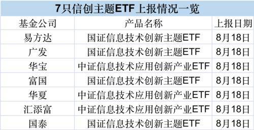证监会网站显示,8月18日,七大ETF业务巨头一起出动,其中易方达、广发基金、富国基金、国泰基金上报了国证信息技术产业主题ETF;而华宝基金、华夏基金、汇添富基金上报了中证信息技术应用创新产业ETF。