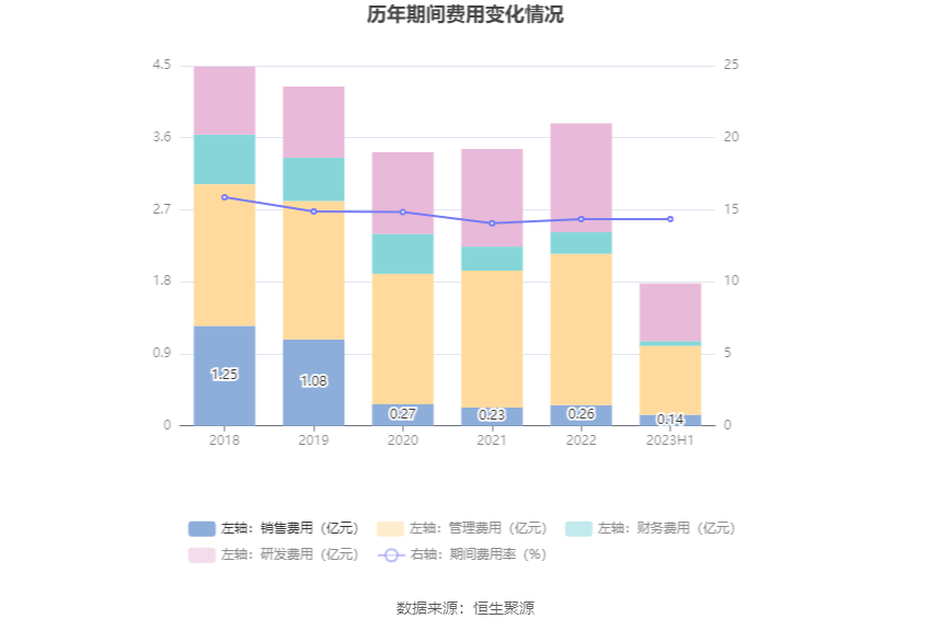 2023年上半年,公司期间费用为1.78亿元,较上年同期减少356.18万元;但期间费用率为14.36%,较上年同期上升0.04个百分点。其中,销售费用同比增长28.69%,管理费用同比下降5.68%,研发费用同比增长4.06%,财务费用同比下降44.09%。
