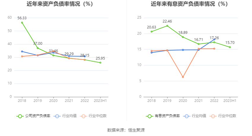 偿债能力方面,公司2023年二季度末资产负债率为25.95%,相比上年末减少2.20个百分点;有息资产负债率为15.70%,相比上年末减少1.56个百分点。