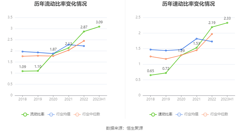 2023年上半年,公司流动比率为3.09,速动比率为2.33。