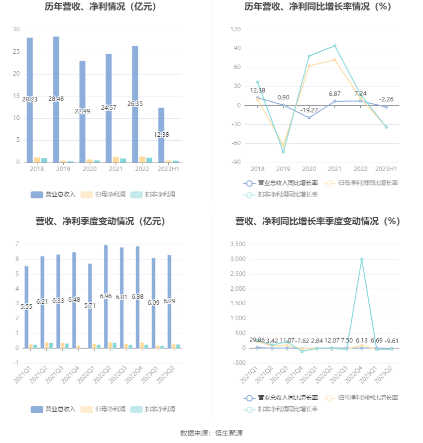 根据半年报,公司第二季度实现营业总收入6.29亿元,同比下降9.61%,环比增长3.17%;归母净利润2748.47万元,同比下降30.93%,环比增长54.04%;扣非净利润2558.31万元,同比下降30.02%,环比增长75.32%。