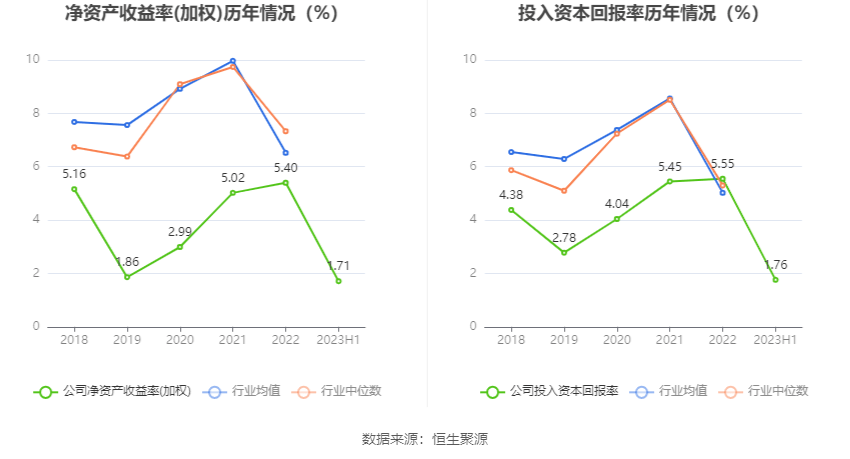 数据显示,2023年上半年公司加权平均净资产收益率为1.71%,较上年同期下降1.01个百分点;公司2023年上半年投入资本回报率为1.76%,较上年同期下降1.17个百分点。