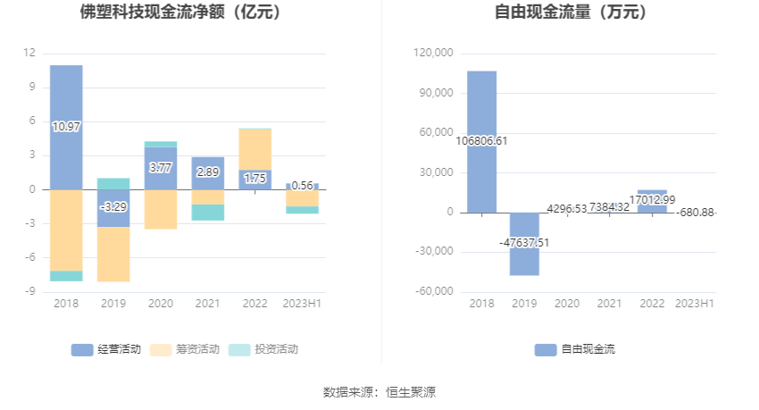 2023上半年,公司经营活动现金流净额为5607.53万元,同比增加5976.62万元;筹资活动现金流净额-1.47亿元,同比减少2.82亿元;投资活动现金流净额-6391.31万元,上年同期为-4764.79万元。