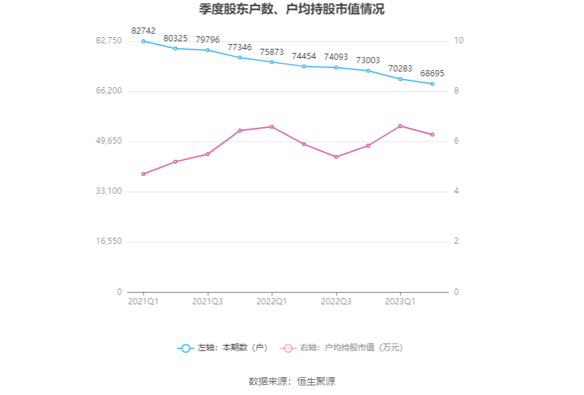 筹码集中度方面,截至2023年二季度末,公司股东总户数为6.87万户,较一季度末下降了1588户,降幅2.26%;户均持股市值由一季度末的6.62万元下降至6.28万元,降幅为5.14%。