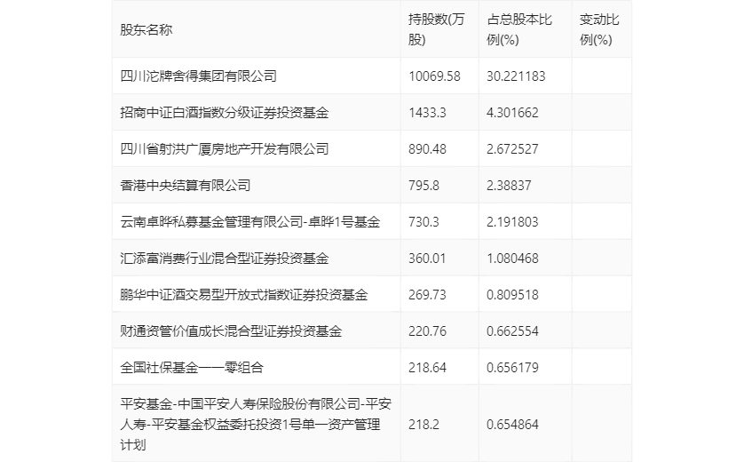 半年报显示,2023年上半年末的公司十大流通股东中,新进股东为财通资管价值成长混合型证券投资基金、全国社保基金一一零组合,取代了一季度末的范社彬、银华富裕主题混合型证券投资基金。在具体持股比例上,招商中证白酒指数分级证券投资基金、香港中央结算有限公司、汇添富消费行业混合型证券投资基金、鹏华中证酒交易型开放式指数证券投资基金持股有所上升,云南卓晔私募基金管理有限公司-卓晔1号基金、平安基金-中国平安人寿保险股份有限公司-平安人寿-平安基金权益委托投资1号单一资产管理计划持股有所下降。