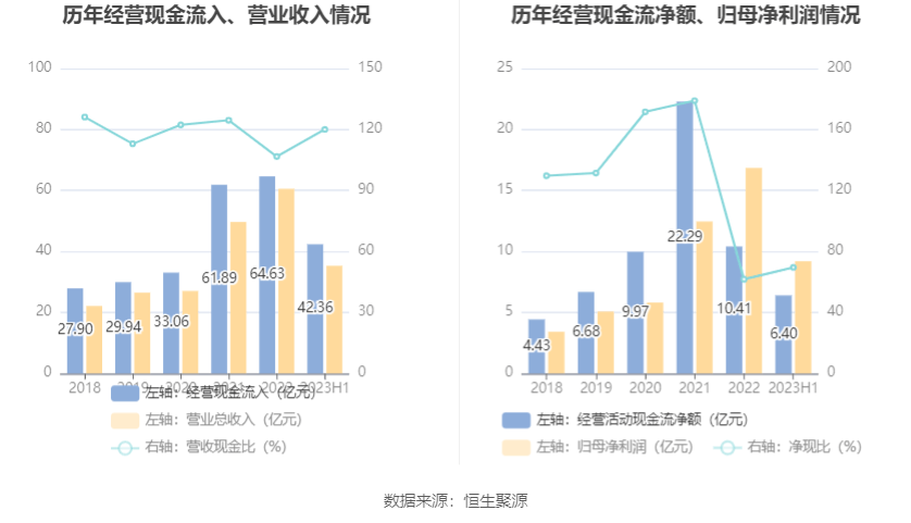 2023年上半年,公司营业收入现金比为120.04%,净现比为69.55%。