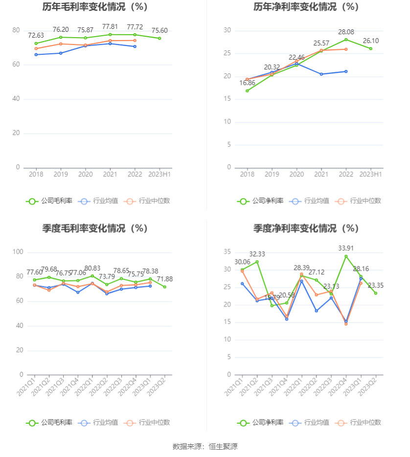 2023年上半年,公司毛利率为75.60%,同比下降2.57个百分点;净利率为26.10%,较上年同期下降1.81个百分点。从单季度指标来看,2023年第二季度公司毛利率为71.88%,同比下降1.91个百分点,环比下降6.50个百分点;净利率为23.35%,较上年同期下降3.77个百分点,较上一季度下降4.81个百分点。
