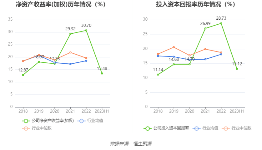 数据显示,2023年上半年公司加权平均净资产收益率为13.48%,较上年同期下降2.54个百分点;公司2023年上半年投入资本回报率为13.12%,较上年同期下降2.37个百分点。