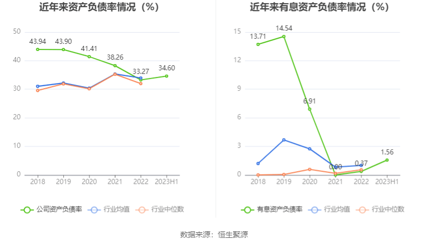 偿债能力方面,公司2023年二季度末资产负债率为34.60%,相比上年末增加1.33个百分点;有息资产负债率为1.56%,相比上年末增加1.19个百分点。