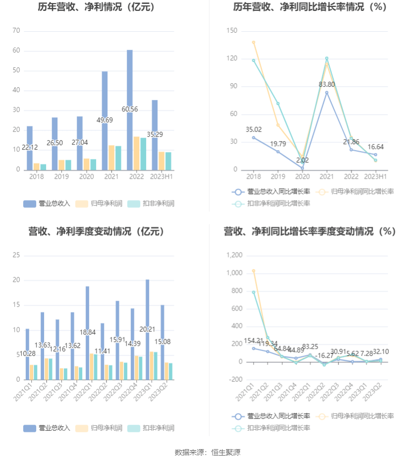 根据半年报,公司第二季度实现营业总收入15.08亿元,同比增长32.10%,环比下降25.39%;归母净利润3.5亿元,同比增长14.83%,环比下降38.51%;扣非净利润3.37亿元,同比增长14.49%,环比下降39.79%。