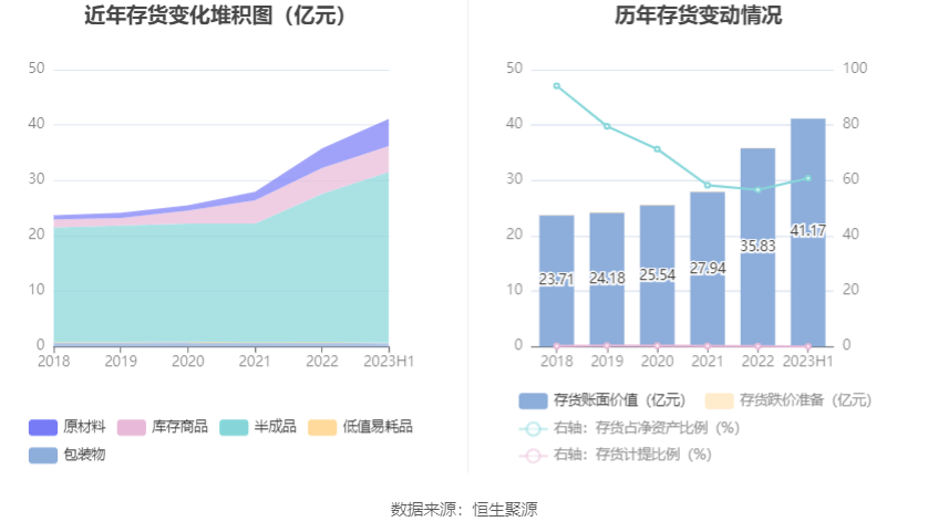 从存货变动来看,截至2023年上半年末,公司存货账面价值为41.17亿元,占净资产的60.81%,较上年末增加5.34亿元。其中,存货跌价准备为241.62万元,计提比例为0.06%。