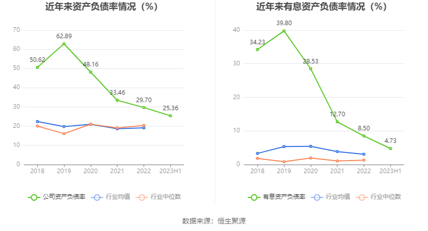 偿债能力方面,公司2023年二季度末资产负债率为25.36%,相比上年末减少4.34个百分点;有息资产负债率为4.73%,相比上年末减少3.77个百分点。