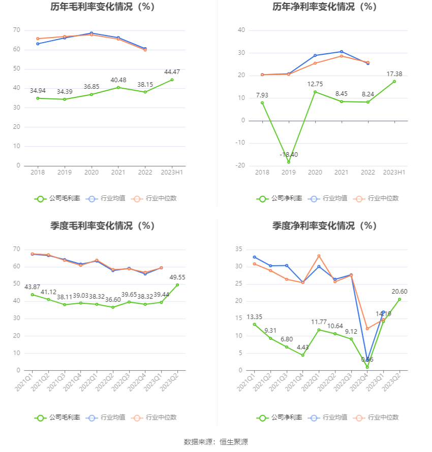 2023年上半年,公司毛利率为44.47%,同比上升7.10个百分点;净利率为17.38%,较上年同期上升6.23个百分点。从单季度指标来看,2023年第二季度公司毛利率为49.55%,同比上升12.95个百分点,环比上升10.11个百分点;净利率为20.60%,较上年同期上升9.96个百分点,较上一季度上升6.41个百分点。
