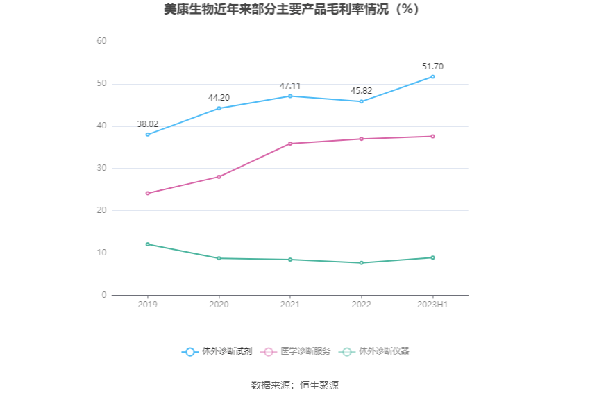 分产品看,体外诊断试剂、医学诊断服务、体外诊断仪器2023年毛利率分别为51.70%、37.59%、8.89%。