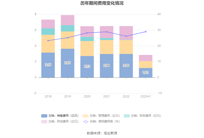 2023年上半年,公司期间费用为2.84亿元,较上年同期减少2364.64万元;但期间费用率为29.05%,较上年同期上升5.23个百分点。其中,销售费用同比下降16.88%,管理费用同比增长10.56%,研发费用同比下降2.91%,财务费用由去年同期的316.64万元变为-198.90万元。