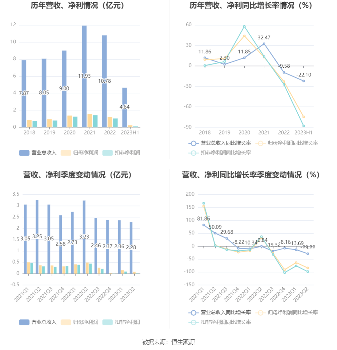 根据半年报,公司第二季度实现营业总收入2.28亿元,同比下降29.22%,环比下降3.15%;归母净利润773.08万元,同比下降84.19%,环比下降48.56%;扣非净利润64.44万元,同比下降98.54%,环比下降93.04%。