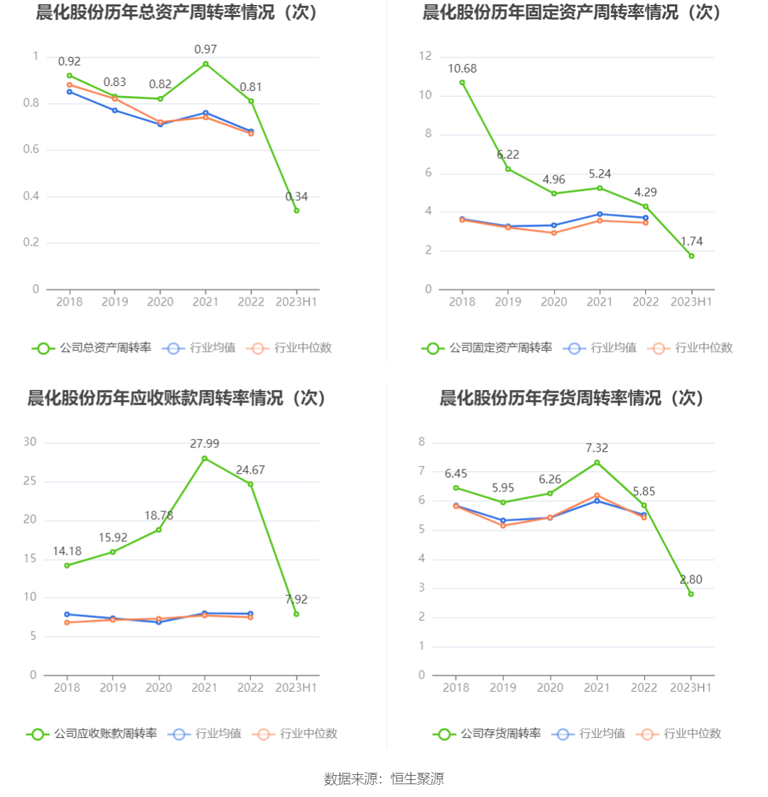 营运能力方面,2023年上半年,公司总资产周转率为0.34次,上年同期为0.44次(2022年上半年行业平均值为0.35次,公司位居同行业22/70);固定资产周转率为1.74次,上年同期为2.37次(2022年上半年行业平均值为2.07次,公司位居同行业26/70);公司应收账款周转率、存货周转率分别为7.92次、2.80次。