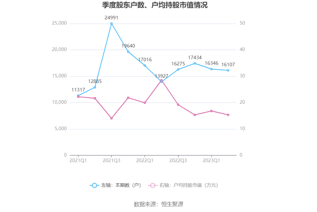 筹码集中度方面,截至2023年二季度末,公司股东总户数为1.61万户,较一季度末下降了239户,降幅1.46%;户均持股市值由一季度末的16.80万元下降至15.34万元,降幅为8.69%。