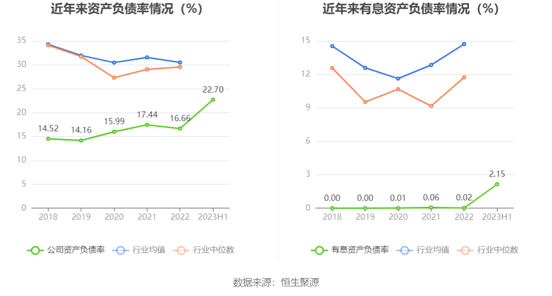 偿债能力方面,公司2023年二季度末资产负债率为22.70%,相比上年末增加6.04个百分点;有息资产负债率为2.15%,相比上年末增加2.13个百分点。