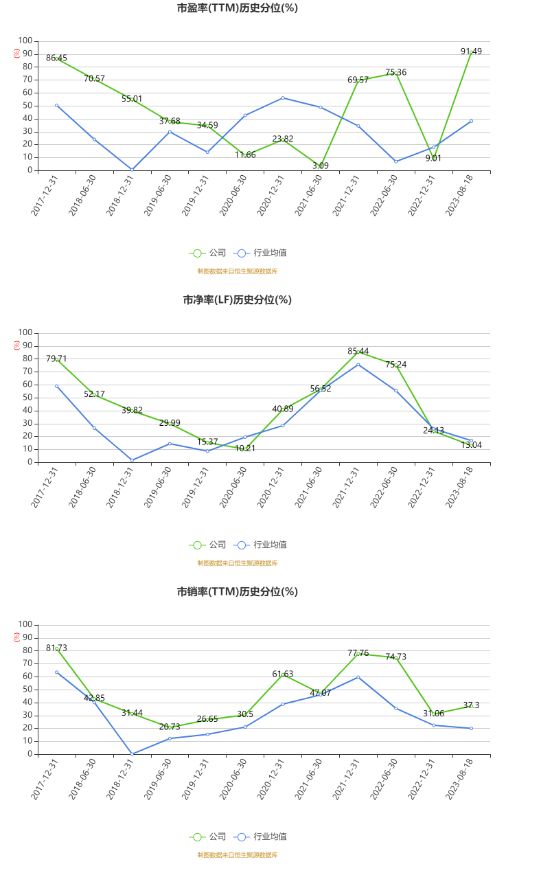 公司近年市盈率(TTM)、市净率(LF)、市销率(TTM)历史分位图如下所示:
