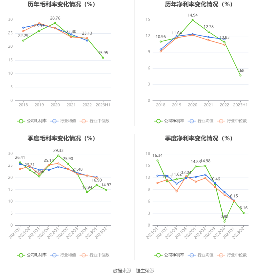 2023年上半年,公司毛利率为15.95%,同比下降11.52个百分点;净利率为4.68%,较上年同期下降10.23个百分点。从单季度指标来看,2023年第二季度公司毛利率为14.97%,同比下降10.93个百分点,环比下降1.93个百分点;净利率为3.16%,较上年同期下降11.82个百分点,较上一季度下降2.99个百分点。
