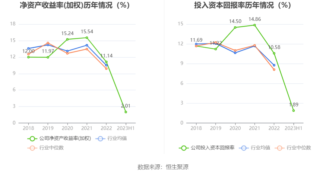 数据显示,2023年上半年公司加权平均净资产收益率为2.01%,较上年同期下降6.31个百分点;公司2023年上半年投入资本回报率为1.89%,较上年同期下降6.28个百分点。