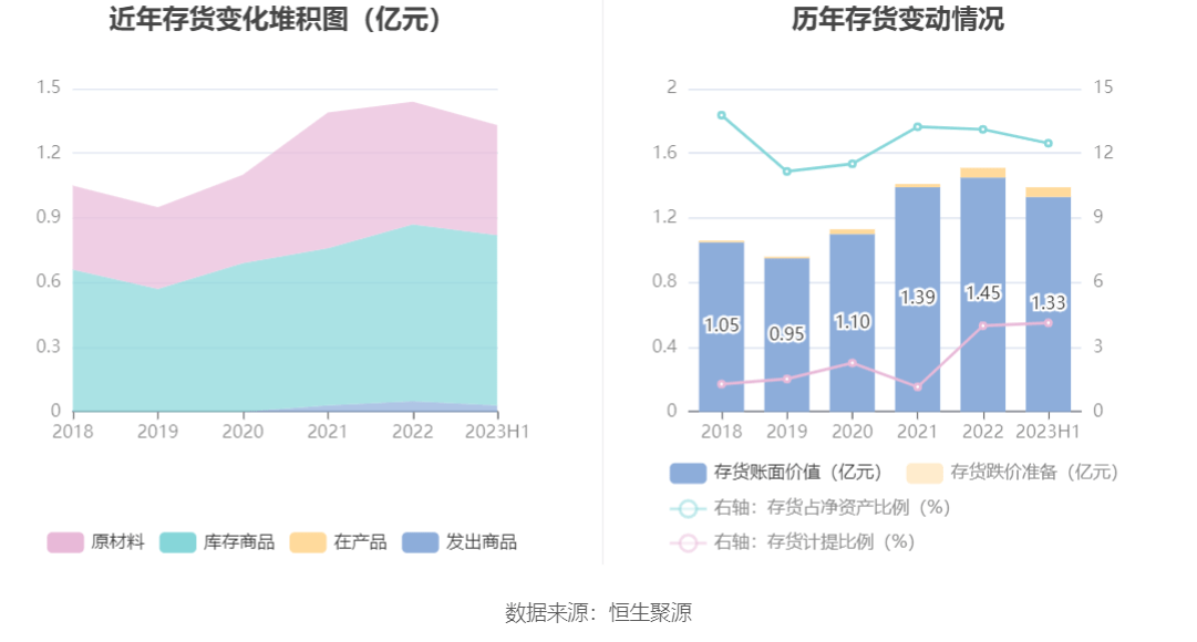 从存货变动来看,截至2023年上半年末,公司存货账面价值为1.33亿元,占净资产的12.47%,较上年末减少1179.4万元。其中,存货跌价准备为574.05万元,计提比例为4.13%。