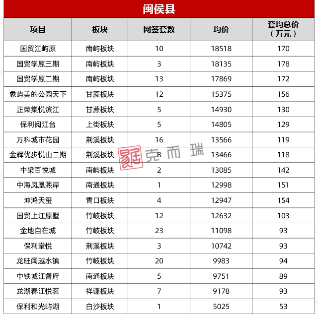 闽侯网签均价最高的板块为南屿板块,均价约为17534元/㎡;