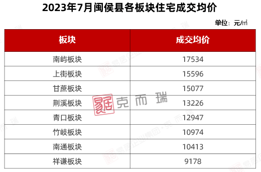 闽侯各板块成交价(不含别墅)