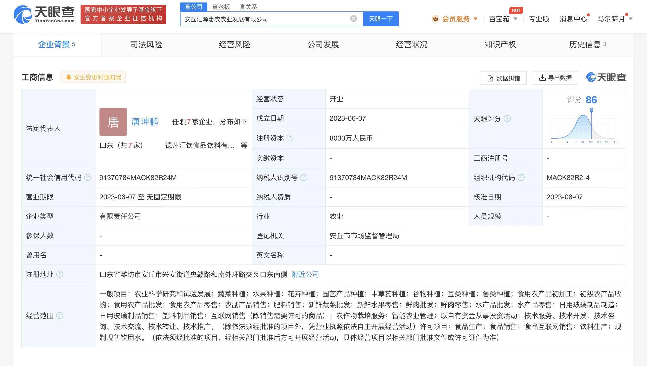 天眼查App显示,近日,安丘汇源惠农农业发展有限公司成立,法定代表人为唐坤鹏,注册资本8000万人民币,经营范围含农业科学研究和试验发展,蔬菜、水果、花卉、中草药、谷物等种植,食用农产品初加工,智能农业管理,食品互联网销售等。股东信息显示,该公司由北京汇源饮料食品集团有限公司全资持股。