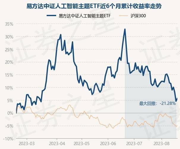 8月18日,易方达中证人工智能主题ETF最新单位净值为0.8元,累计净值为0.8元,较前一交易日下跌2.72%。历史数据显示该基金近1个月下跌11.74%,近3个月下跌7.11%,近6个月上涨2.83%,近1年上涨5.88%。该基金近6个月的累计收益率走势如下图: