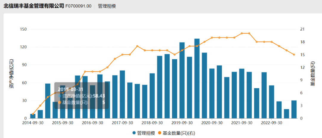但这种规模“小微”境况并不是一开始就有的。根据wind,北信瑞丰基金管理规模曾在2018年四季度突破百亿,并于2022年一季度规模达到近135亿元高位,但规模持续回落,截至今年一季度末时只有15亿元左右。虽然规模大幅缩水,但北信瑞丰基金管理的产品数量,却一直保持在15只到17只之间。这意味着,该公司的规模回落主要源于存量基金的规模下滑,这很可能和基金投资业绩有密切关系。