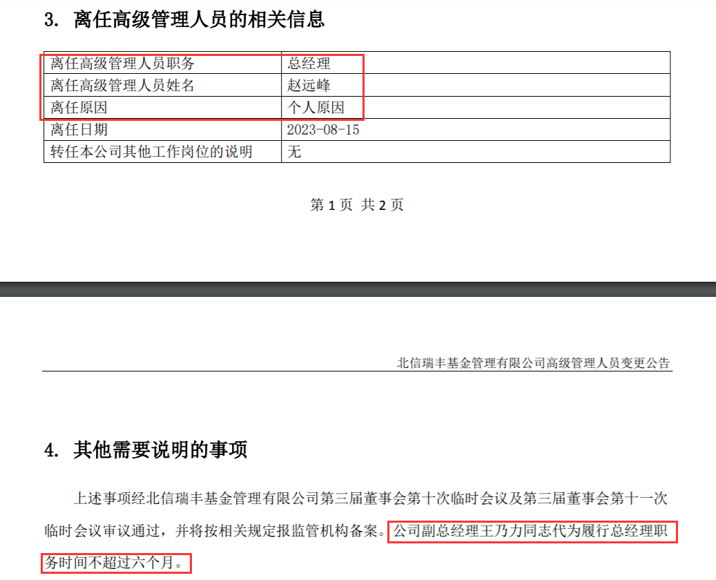 根据北信瑞丰基金公告,经该公司第三届董事会第十次临时会议及第三届董事会第十一次临时会议审议通过,因个人原因,董事长李永东和总经理赵远峰均于8月15日离任。值得一提的是,李永东离任之前还是公司代任督察长。在今年4月,北信瑞丰基金督察长张恩源因个人原因辞职,督察长职务由李永东代任。