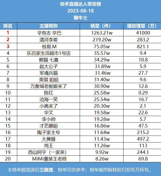 快手榜一辛有志 辛巴,销量1263.21万件;榜二清河李哥,销量219.2万件;榜三桂哥.M,销量75.05万件。昨日中午,辛巴在快手开启辛选818五周年直播专场,卖出超167款商品,销售额超过了17.89亿。