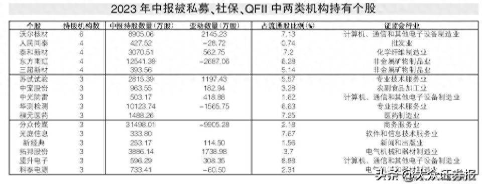 记者观察发现,有16只个股同时被私募、社保和QFII中的两类机构相中,纷纷在二季度持有。比如,沃尔核材被5家私募和1家社保基金持有,三超新材被1家私募和3家OFII持有,且全部为二季度新进。(见表)