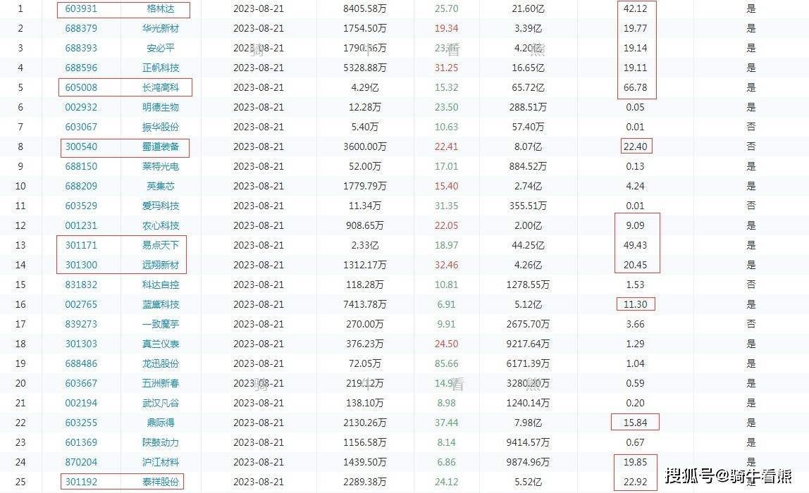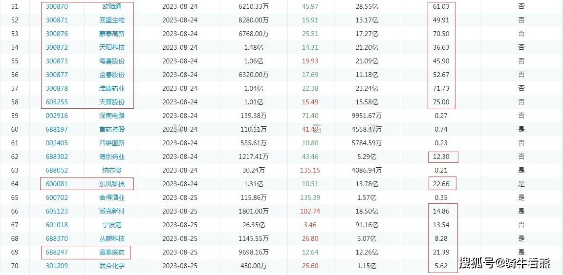 8月24日(周四)捷强装备解禁比例达到50.94%;蓝盾光电解禁比例达到34.89%;美畅股份解禁比例达到49.6%;安克创新解禁比例达到59.72%;安倍亿解禁比例达到61.73%;圣元环保解禁比例达到42.67;康泰医学解禁比例达到46.84%;南大环境解禁比例达到75%;欧陆通解禁比例达到61.03%;回盛生物解禁比例达到49.91%;蒙泰高新解禁比例达到70.5%;天阳科技解禁比例达到36.63%;海晨股份解禁比例达到45.9%;金春股份解禁比例达到52.67%;维康药业解禁比例达到71.73%;天普股份解禁比例达到75%;东风科技解禁比例达到22.66%。