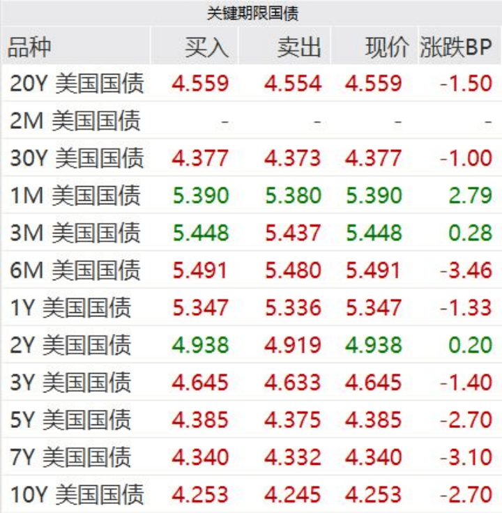 美东时间8月18日,美债收益率多数收跌,2年期美债收益率涨0.2个基点报4.938%,3年期美债收益率跌1.4个基点报4.645%,5年期美债收益率跌2.7个基点报4.385%,10年期美债收益率跌2.7个基点报4.253%,30年期美债收益率跌1个基点报4.377%。