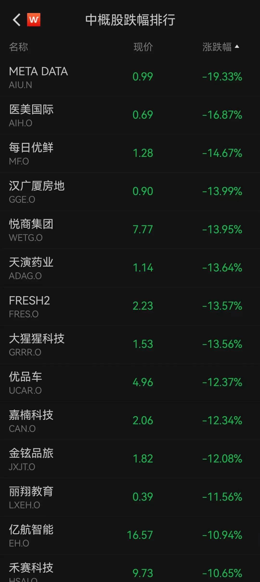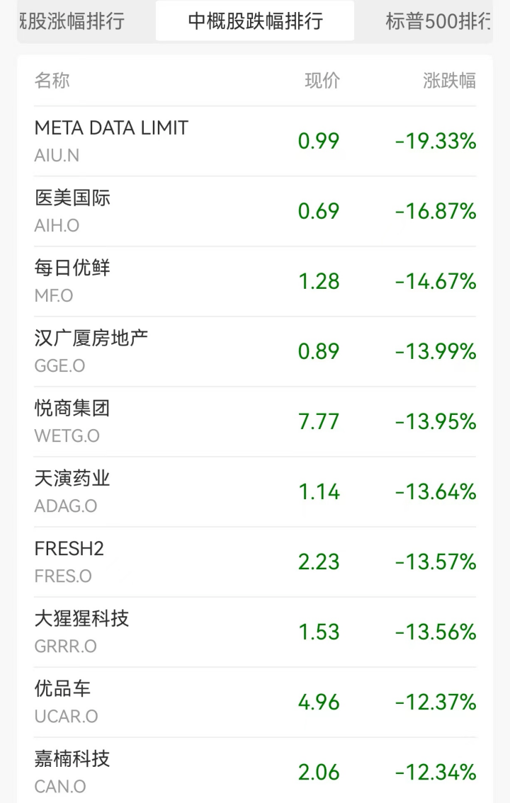 热门中概股普遍下跌。META DATA LIMIT 跌19.33%,医美国际跌16.87%,每日优鲜跌14.67%,领跌中概股。大猩猩科技跌13.56%,优品车跌12.37%,嘉楠科技跌12.34%,亿航智能跌10.94%,禾赛科技跌10.65%,达达集团跌10.61%,亚朵跌8.41%,唯品会跌8.04%,哔哩哔哩跌6.38%。