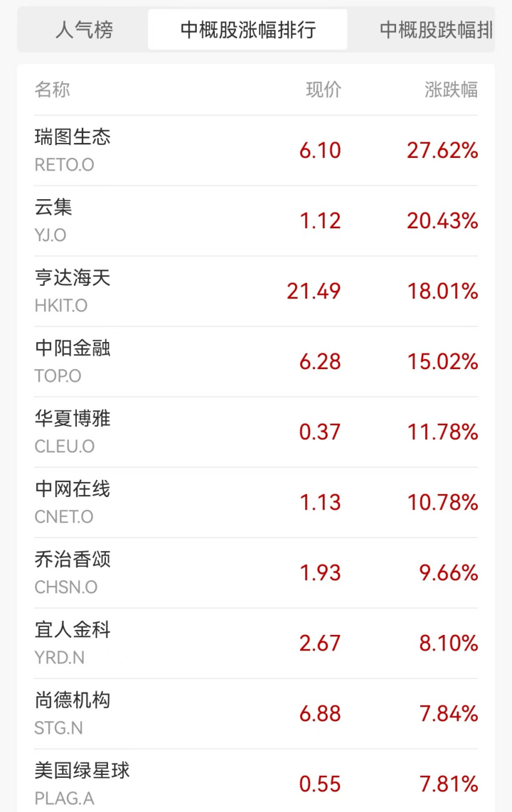 涨幅方面,瑞图生态涨27.62%,云集涨20.43%,亨达海天涨18.01%,领涨中概股。中阳金融涨15.02%,图森未来涨4.49%,雾芯科技涨4.23%。